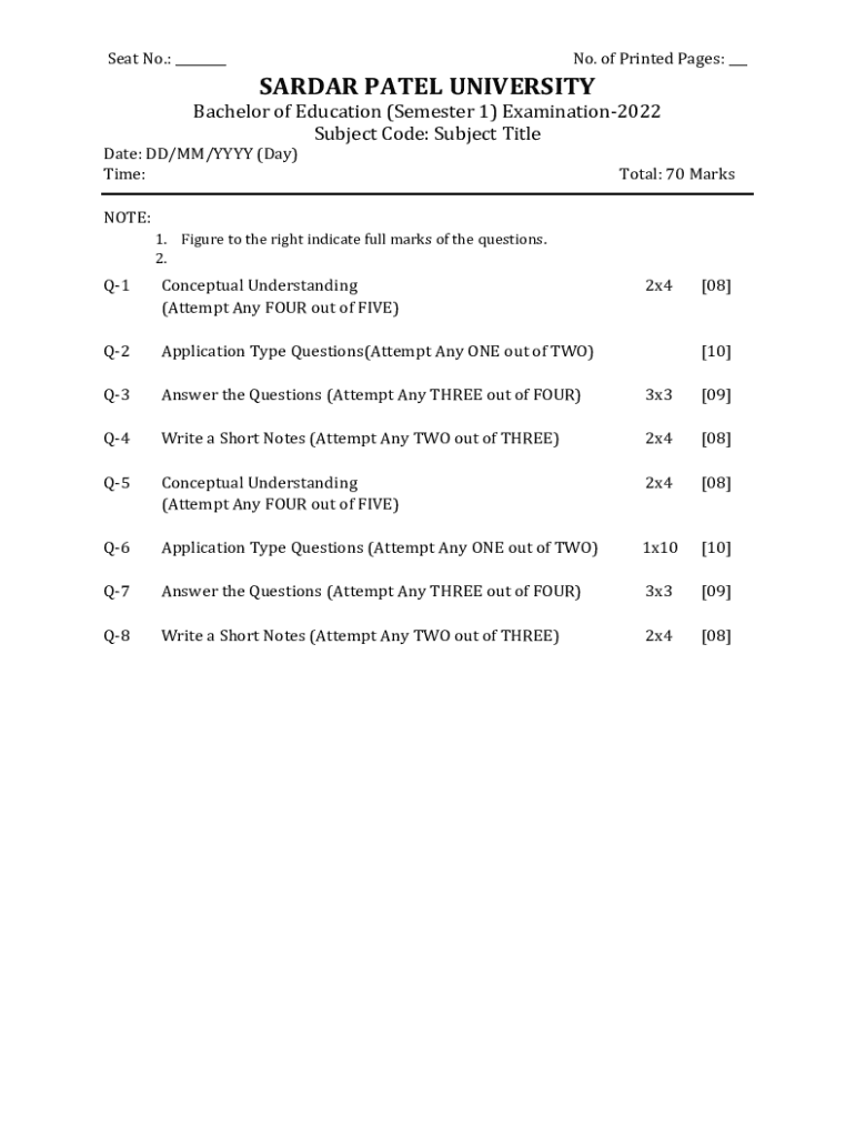 Seat No.: ___No. Of Printed Pages: ___SA RDAR PATEL UNIVERSITYBachelor of Education (Semester 1) Examination2022 Subject Code: Subject Title Date: DD/MM/YYY (Day) Time:Total: 70 Banknote: 1. Figure