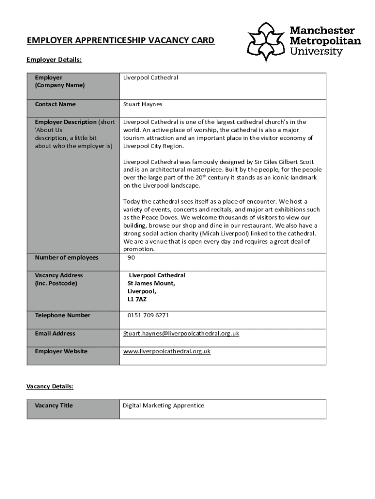 EMPLOYER APPRENTICESHIP VACANCY CARD Employer Details: Employer (Company Name)Liverpool CathedralContact Name Stuart HaynesEmployer Description (short \'About Us\' description, a little about whom