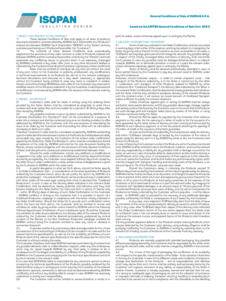 General Conditions of Sale of ISO PAN S.P.A. based on the AIPP EG General Conditions of Sale (rev. 2021) 1. OBJECT AND PARTIES TO THE CONTRACT 1.1These General Conditions of Sale shall apply to all