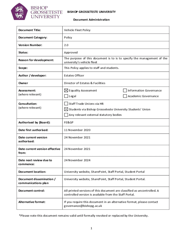 BISHOP The GROSSEST UNIVERSITY Document Administration Document Title:Vehicle Fleet PolicyDocument Category:PolicyVersion Number:2.0Status:ApprovedReason for development:The purpose of this document