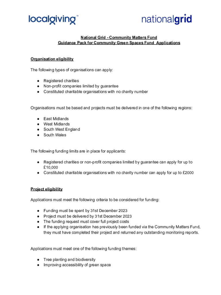 National Grid Community Matters Fund Guidance Pack for Community Green Spaces Fund ApplicationsOrganisation eligibility The following types of organizations can apply: Registered charities Nonprofit