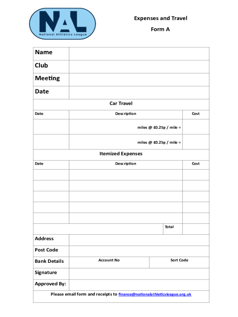 Expenses and Travel Form Name Club Me, NG Date Car Travel DateDescrip, cost miles @ 0.25p / mile miles @ 0.25p / mile Itemized Expenses DateDescrip, onCostTotalAddress Post Code Bank DetailsAccount