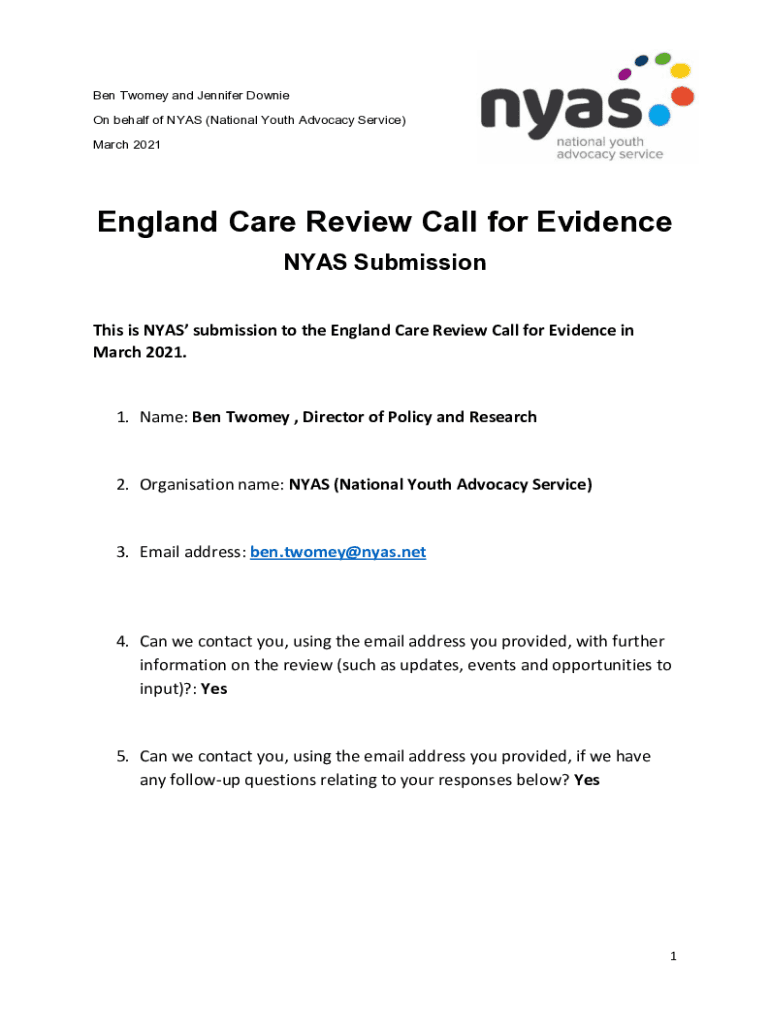 Ben Women and Jennifer Donnie On behalf of NYASA (National Youth Advocacy Service) March 2021England Care Review Call for Evidence NYASA Submission This is NYASA submission to the England Care Review