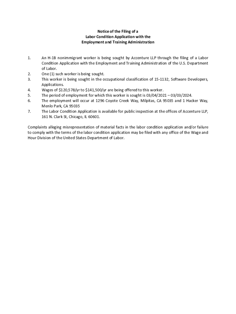 Notice of the Filing of a Labor Condition Application with the Employment and Training Administration 1. 2. 3. 4. 5. 6. 7. An H1B nonimmigrant worker is being sought by Accenture LLP through the filing