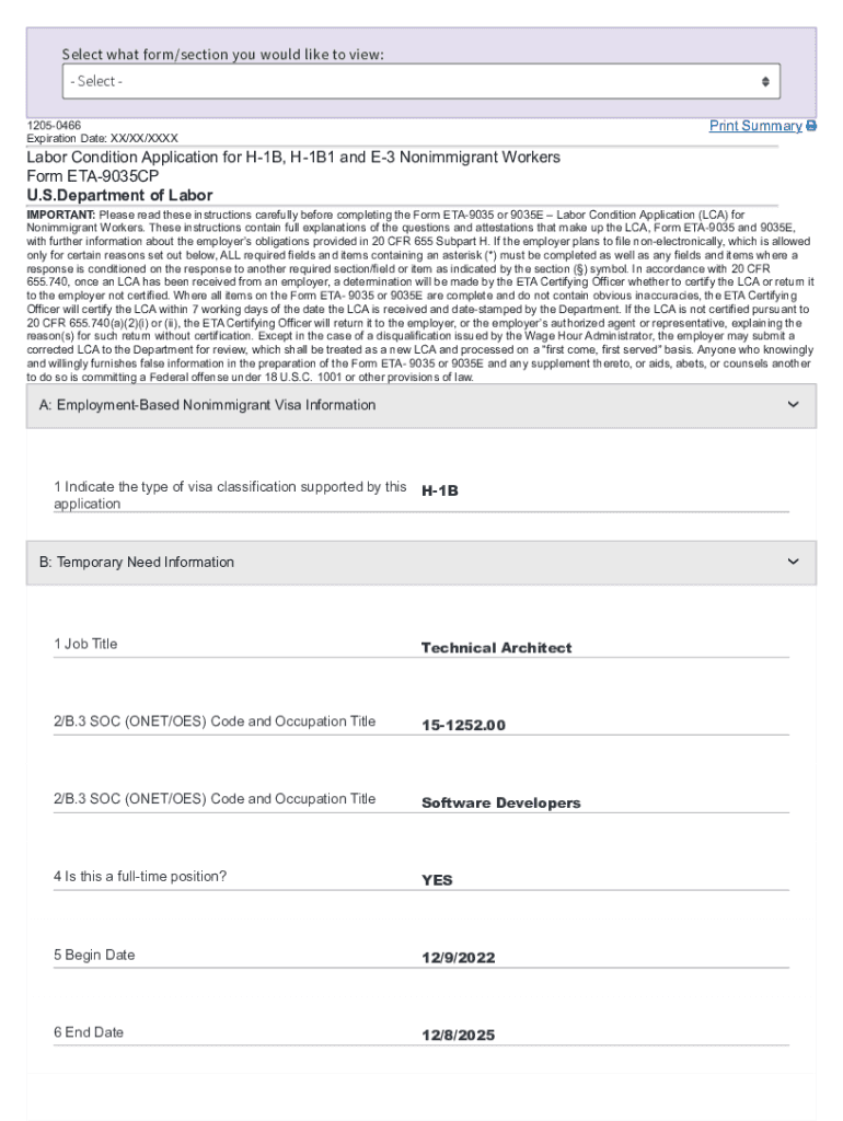 Select what form/section you would like to view: Select Print Summary12050466 Expiration Date: XX/XX/XXXXLabor Condition Application for H1B, H1B1 and E3 Nonimmigrant Workers Form ETA9035CP U.S. Department