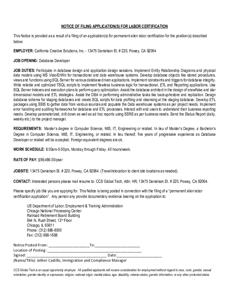 NOTICE OF FILING APPLICATION(S) FOR LABOR CERTIFICATION This Notice is provided as a result of a filing of an application(s) for permanent alien labor certification for the position(s) described below: