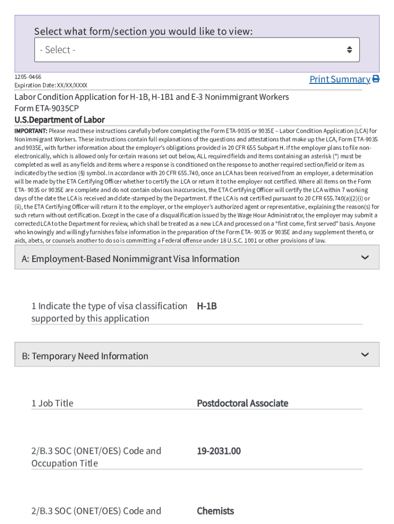 Select what form/section you would like to view: Select 12050466 Expiration Date: XX/XX/XXXXPrint SummaryLabor Condition Application for H1B, H1B1 and E3 Nonimmigrant Workers Form ETA9035CP U.S. Department