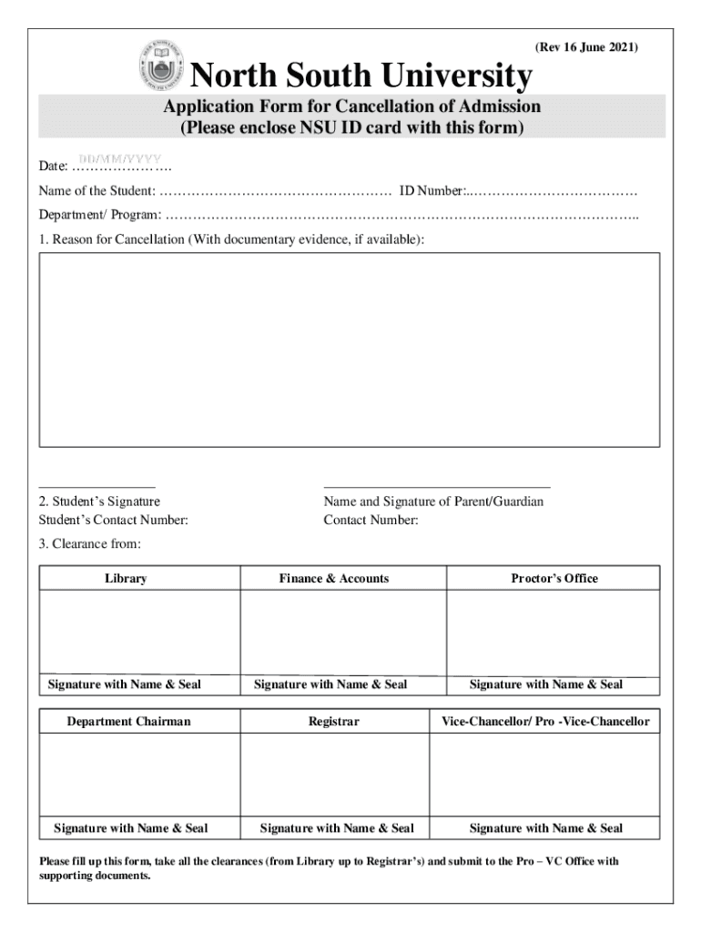 (Rev 16 June 2021)North South University Application Form for Cancellation of Admission (Please enclose NSU ID card with this form) DD/MM/YYYYDate:. Name of the Student: ID Number:. Department/ Program:.