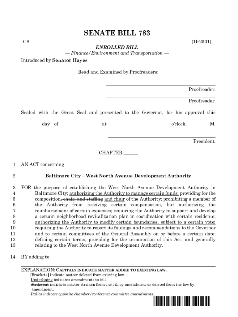 SENATE BILL 783 C8(1lr2501)ENROLLED BILL Finance/Environment and Transportation Introduced by Senator Hayes Read and Examined by Proofreaders: ___ Proofreader. ___ Proofreader. Sealed with the Great
