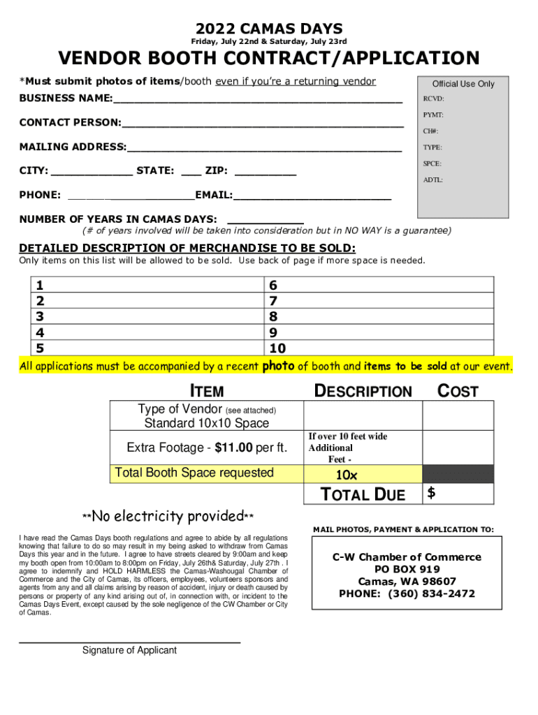 2022 CAMPS DAYS Friday, July 22nd & Saturday, July 23rdVENDOR BOOTH CONTRACT/APPLICATION *Must submit photos of items/booth even if you're a returning vendor BUSINESS NAME:___ CONTACT PERSON:___Official