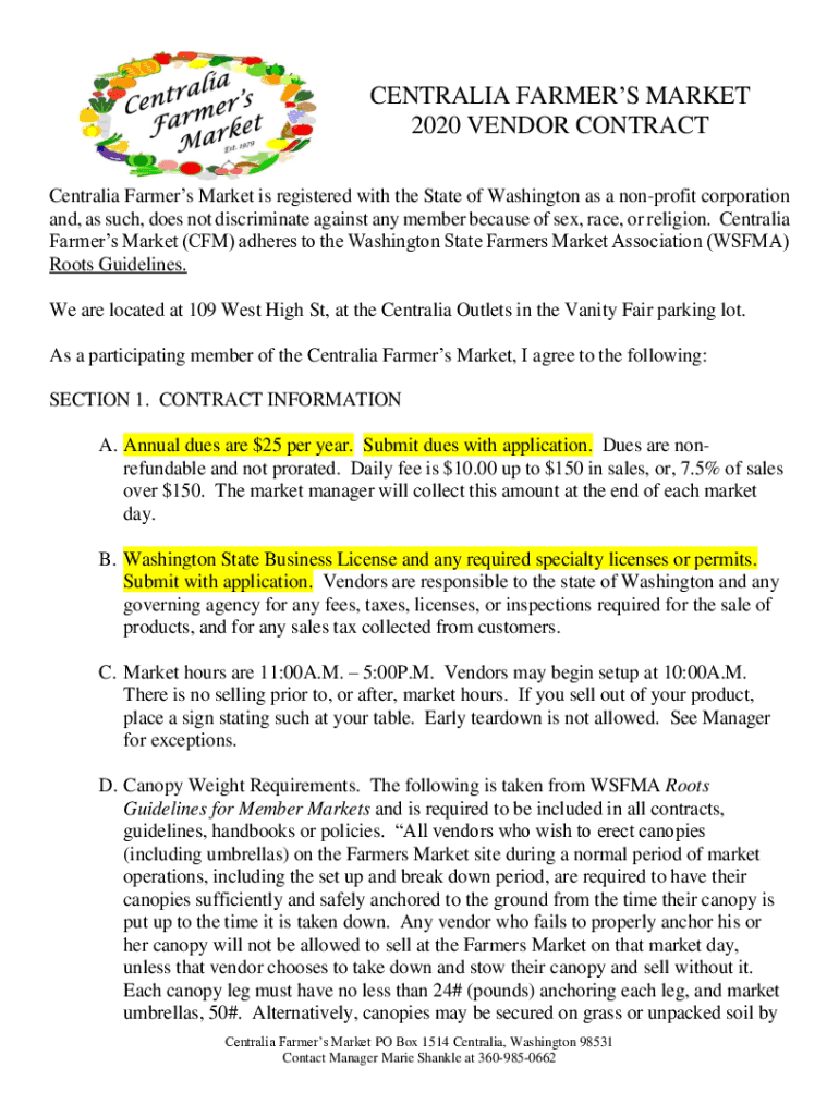 CENTRAL IA FARMERS MARKET 2020 VENDOR CONTRACT Central Farmers Market is registered with the State of Washington as a nonprofit corporation and, as such, does not discriminate against any member because