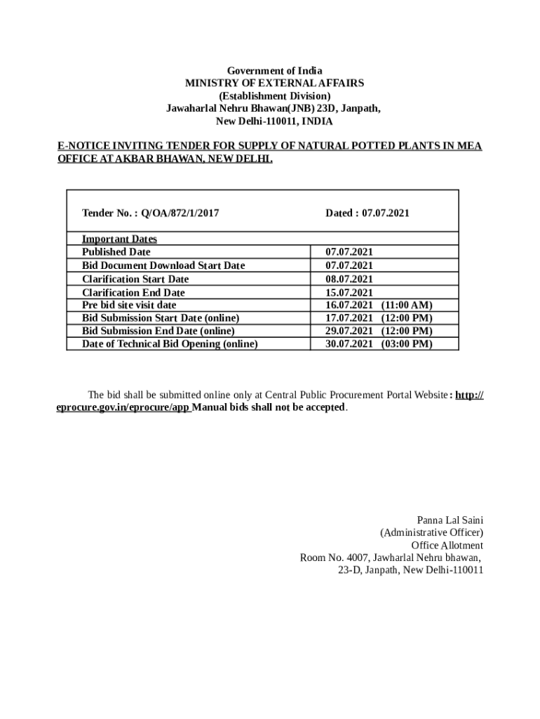 Government of India MINISTRY OF EXTERNAL AFFAIRS (Establishment Division) Jawaharlal Nehru Shawn(JOB) 23D, Jan path, New Delhi110011, INDIA NOTICE INVITING TENDER FOR SUPPLY OF NATURAL POTTED PLANTS
