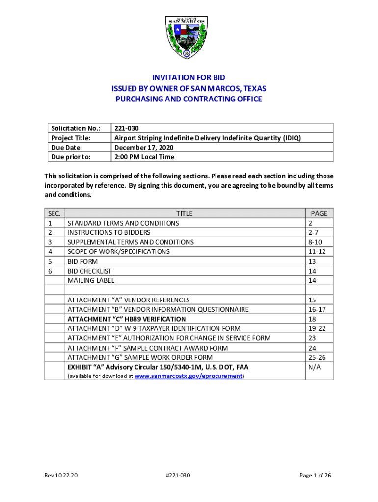 INVITATION FOR BID ISSUED BY OWNER OF SAN MARCOS, TEXAS PURCHASING AND CONTRACTING OFFICE Solicitation No.: Project Title: Due Date: Due prior to:221030 Airport Striping Indefinite Delivery Indefinite