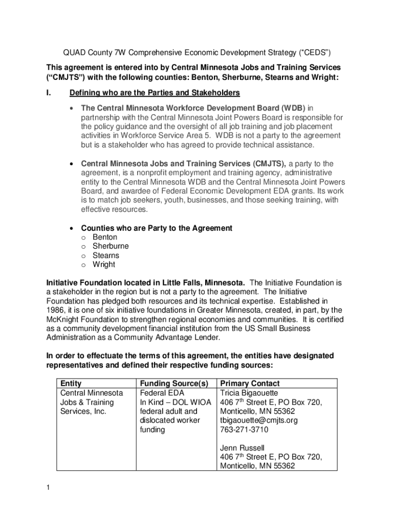 QUAD County 7W Comprehensive Economic Development Strategy (CDs) This agreement is entered into by Central Minnesota Jobs and Training Services (CMJ TS) with the following counties: Benton, Hepburn,