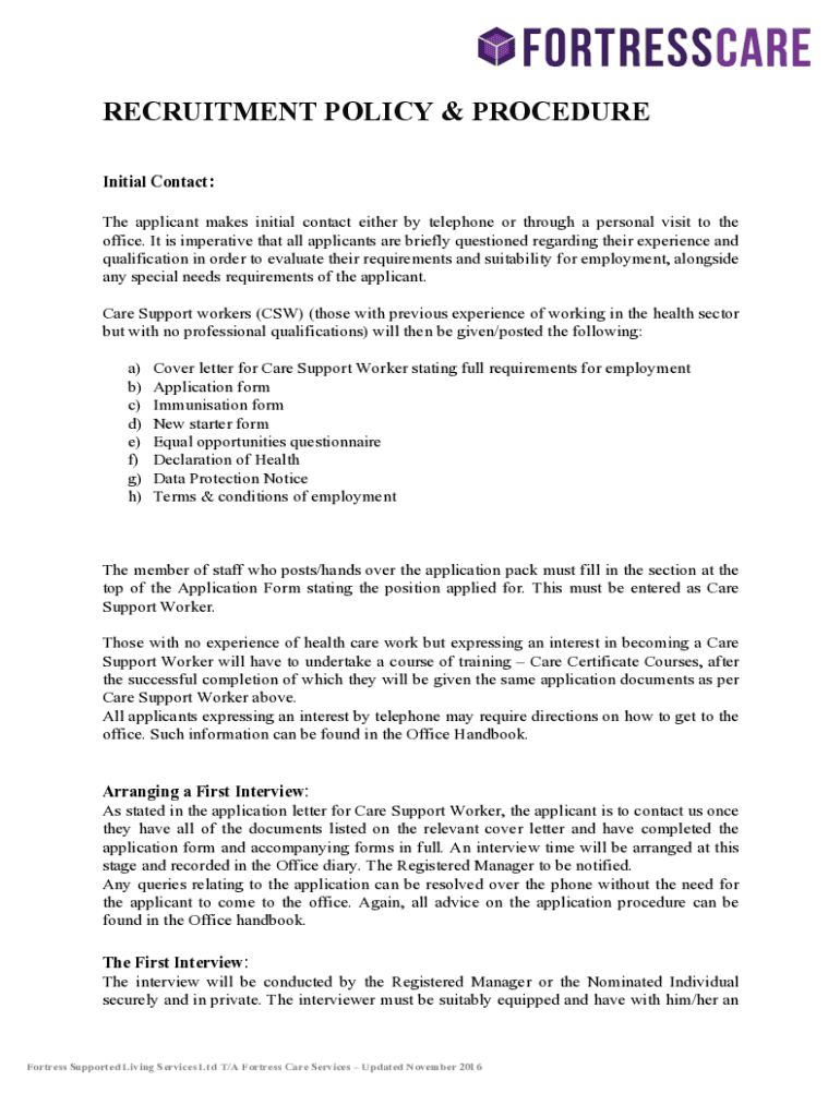 RECRUITMENT POLICY & PROCEDURE Initial Contact: The applicant makes initial contact either by telephone or through a personal visit to the office. It is imperative that all applicants are briefly