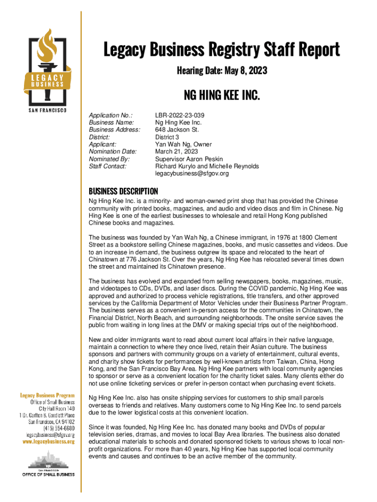Legacy Business Registry Staff Report Hearing Date: May 8, 2023NG HING SEE INC. Application No.: Business Name: Business Address: District: Applicant: Nomination Date: Nominated By: Staff Contact:LBR202223039