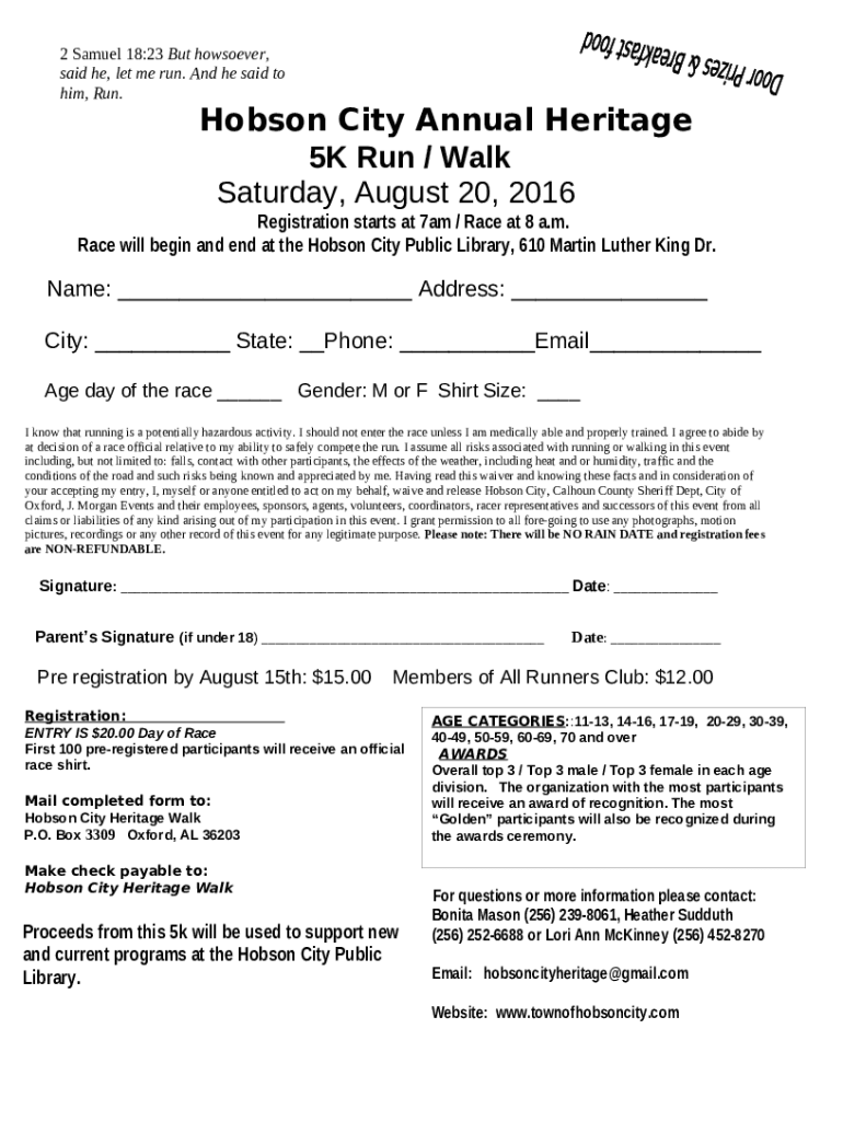Instructions for the Hobson City Annual Heritage 5K Run / Walk form