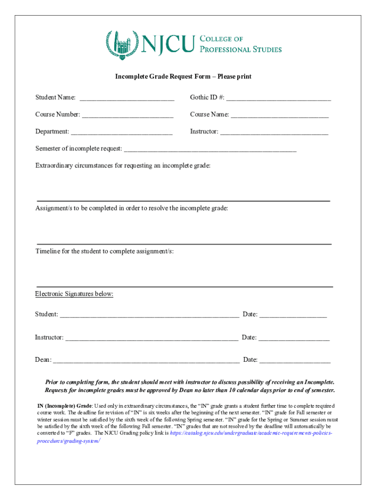 The incomplete grade request form is a document submitted by students who were unable to complete all the requirements of a course by the end of the semester.