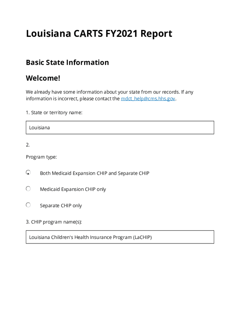 Louisiana CARTS FY2021 Report Basic State Information Welcome! We already have some information about your state from our records. If any information is incorrect, please contact the mdct_help@cms.hhs.gov.