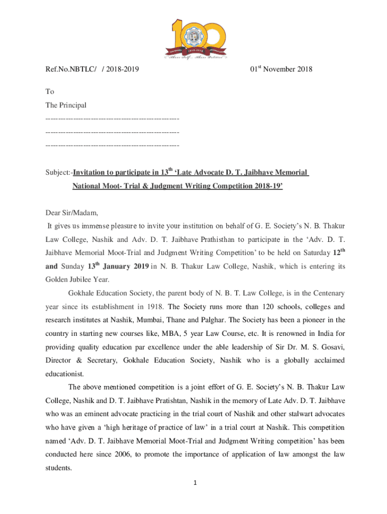 01st November 2018Ref. No.NBTLC/ / 20182019 To The Principal Subject:Invitation to participate in 13th Late Advocate D. T. Vaibhav Memorial National Moot Trial & Judgment Writing Competition 201819Dear