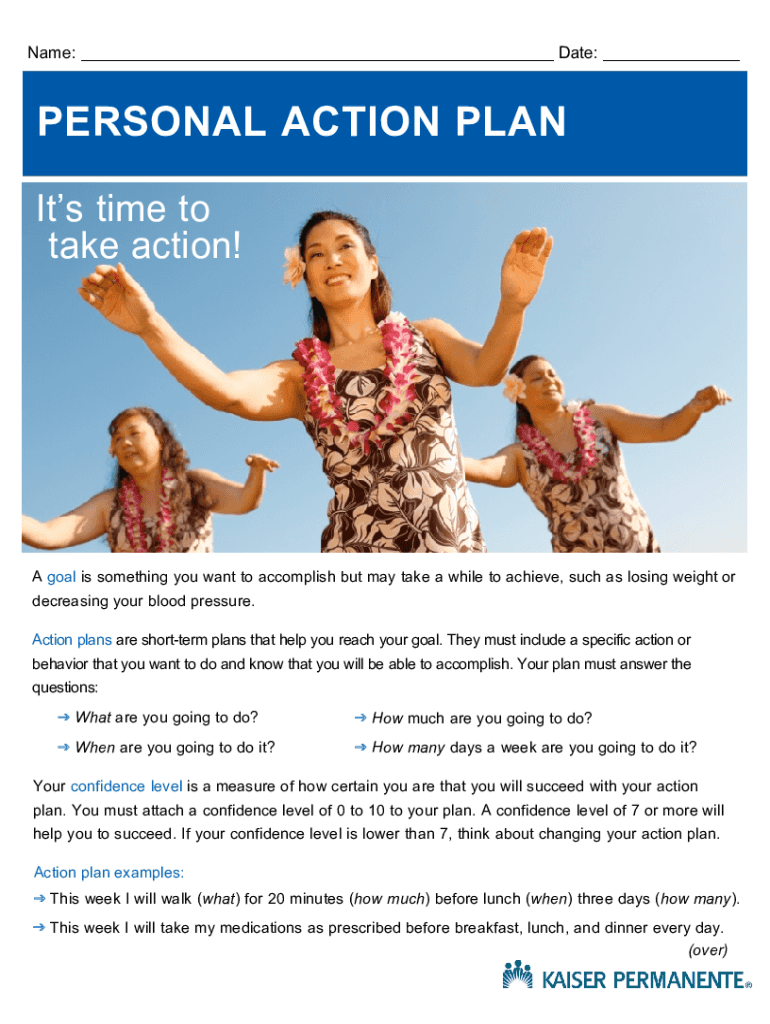 Name: ___ Date: ___PERSONAL ACTION PLAN It's time to take action! A goal is something you want to accomplish but may take a while to achieve, such as losing weight or decreasing your blood pressure.