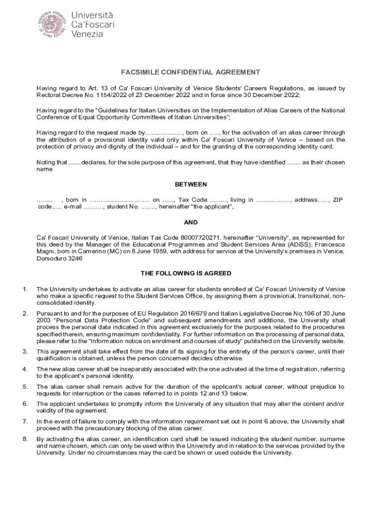 FACSIMILE CONFIDENTIAL AGREEMENT Having regard to Art. 13 of Ca\' Oscar University of Venice Students\' Careers Regulations, as issued by Pectoral Decree No. 1154/2022 of 23 December 2022 and in force