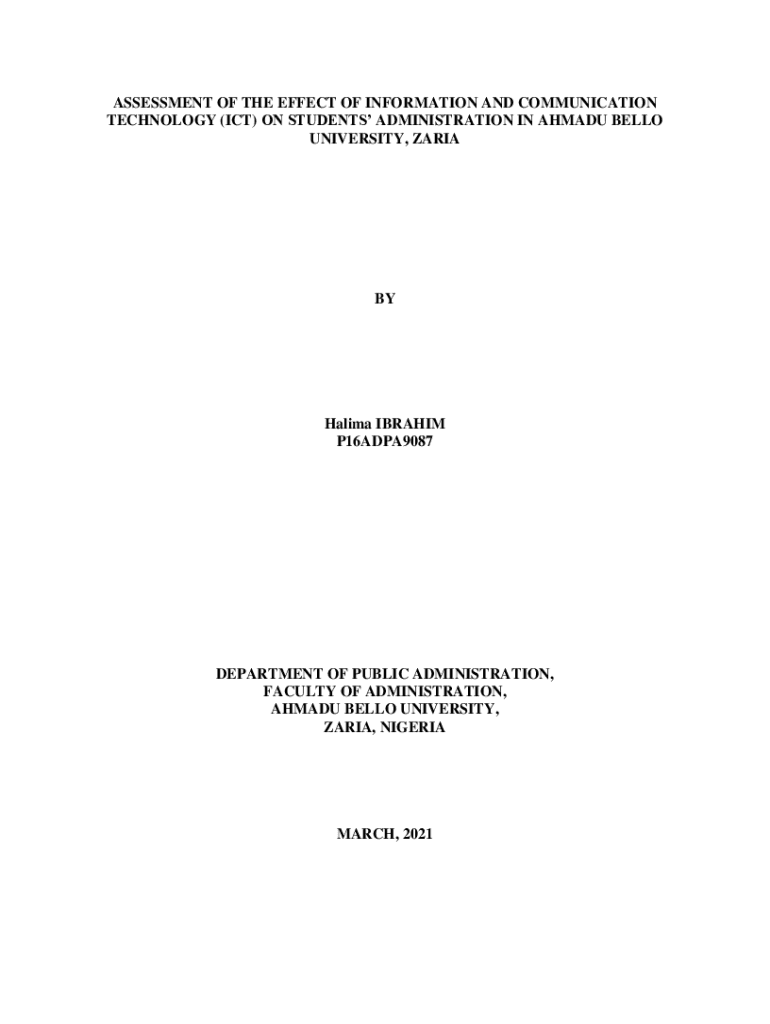 ASSESSMENT OF THE EFFECT OF INFORMATION AND COMMUNICATION TECHNOLOGY (ICT) ON STUDENTS ADMINISTRATION IN AHMAD HELLO UNIVERSITY, ZARIABYHalima IBRAHIM P16ADPA9087DEPARTMENT OF PUBLIC ADMINISTRATION,
