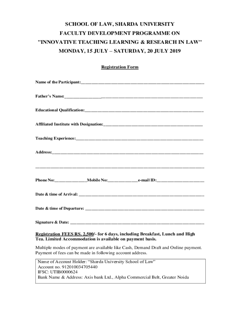 SCHOOL OF LAW, SHARDS UNIVERSITY FACULTY DEVELOPMENT Program ON \” INNOVATIVE TEACHING LEARNING & RESEARCH IN LAW\” MONDAY, 15 JULY SATURDAY, 20 JULY 2019 Registration Forename of the Participant:___