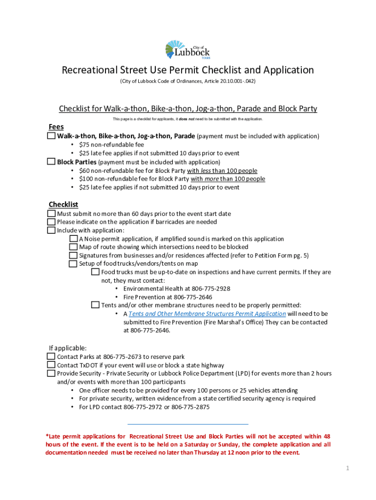RecreationalStreetUsePermitChecklistandApplication (CityofLubbockCodeofOrdinances,Article20.10.001.042)ChecklistforWalkathon, Keaton, Jonathon, ParadeandBlockParty This page is a checklist for applicants,