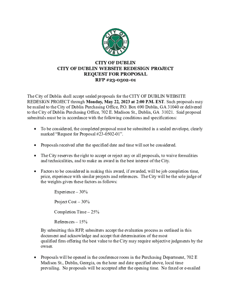 CITY OF DUBLIN CITY OF DUBLIN WEBSITE REDESIGN PROJECT REQUEST FOR PROPOSAL RFP #23050201 The City of Dublin shall accept sealed proposals for the CITY OF DUBLIN WEBSITE REDESIGN PROJECT through Monday,
