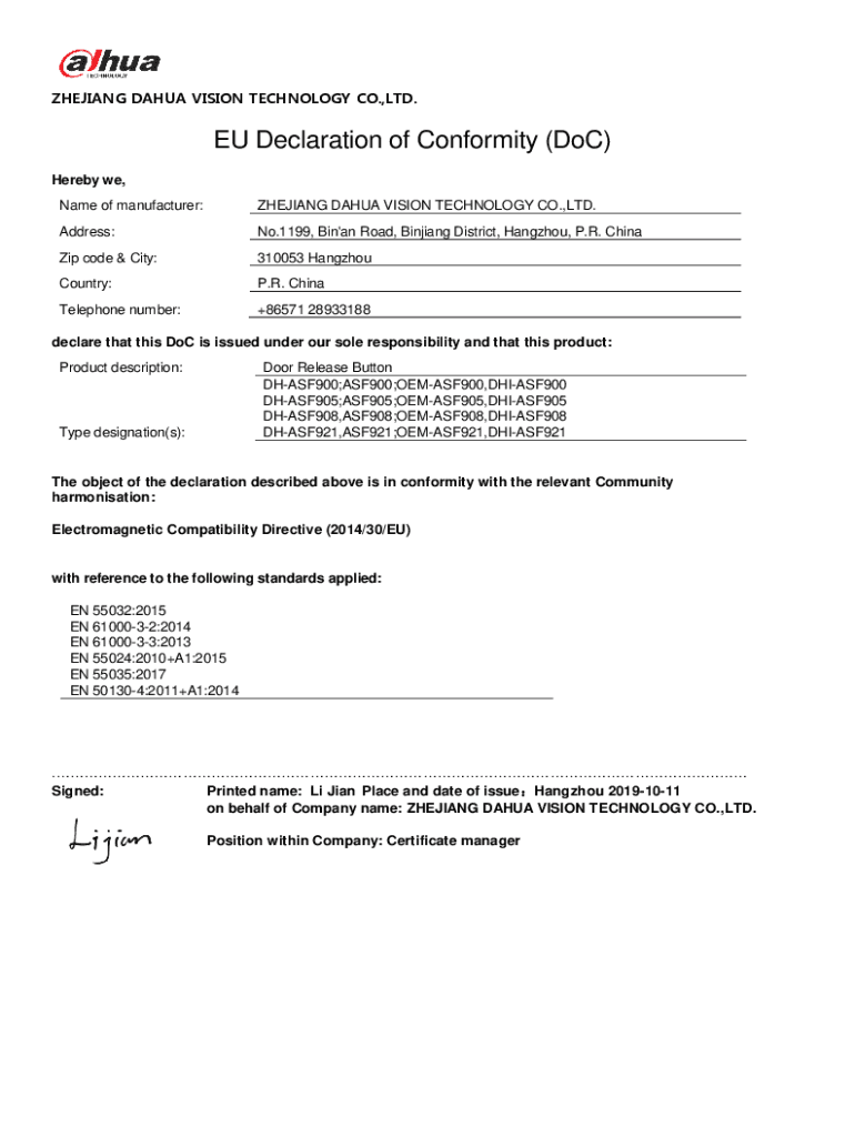 ZHEJIANG DATA VISION TECHNOLOGY CO., LTD.EU Declaration of Conformity (Doc) Hereby we, Name of manufacturer:ZHEJIANG DATA VISION TECHNOLOGY CO., LTD. Address:No.1199, Bin\'a Road, Xinjiang District,