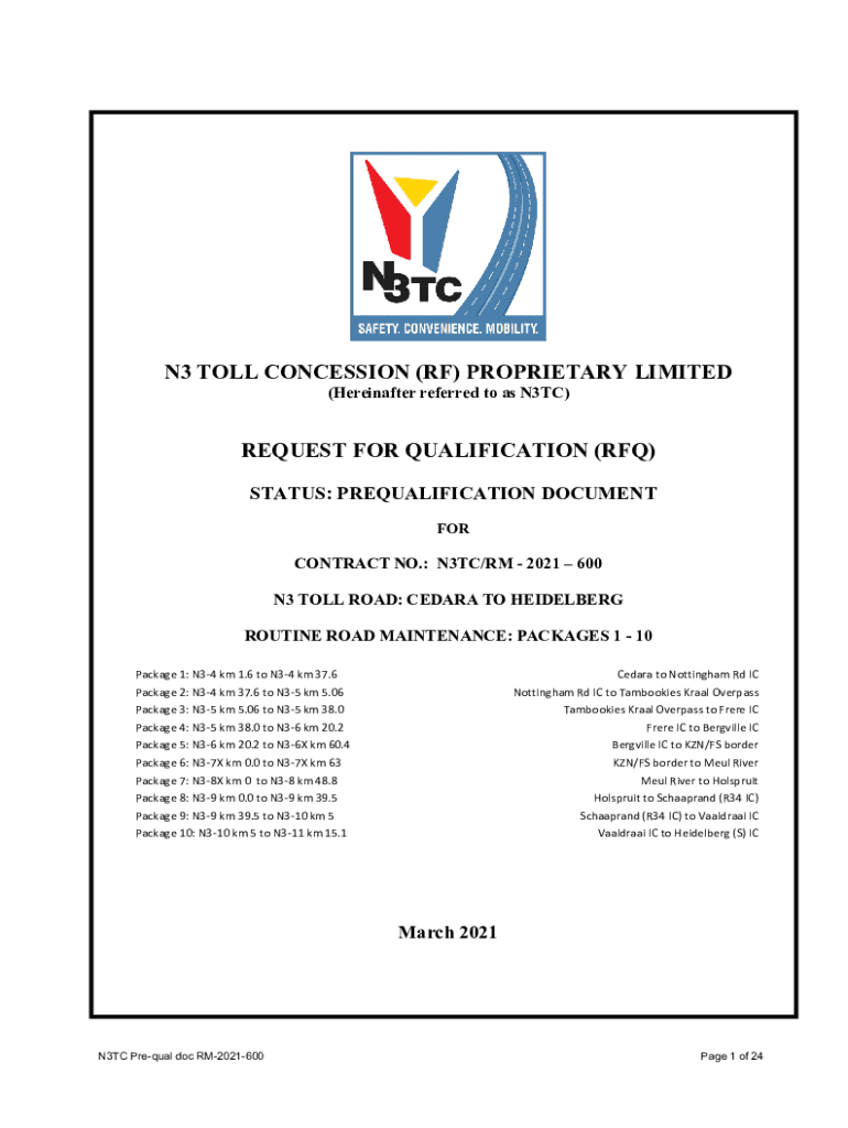 N3 TOLL CONCESSION (RF) PROPRIETARY LIMITED (Hereinafter referred to as N3TC)REQUEST FOR QUALIFICATION (RFQ) STATUS: PREQUALIFICATION DOCUMENT CONTRACT NO.: N3TC/RM 2021 600 N3 TOLL ROAD: CEDAR TO