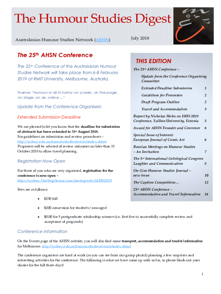 The Humor Studies Digest Australasian Humor Studies Network (AHS)The 25th AHS Conference The 25th Conference of the Australasian Humor Studies Network will take place from 68 February 2019 at EMIT