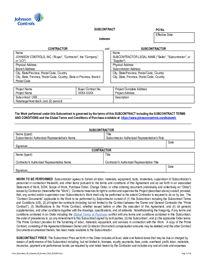 SUBCONTRACT PO No. Effective Date:between CONTRACTOR Name JOHNSON CONTROLS, INC. (Buyer, Contractor, the Company, or JCI) Physical Address Branch Address City, State/Province, Postal Code, Country