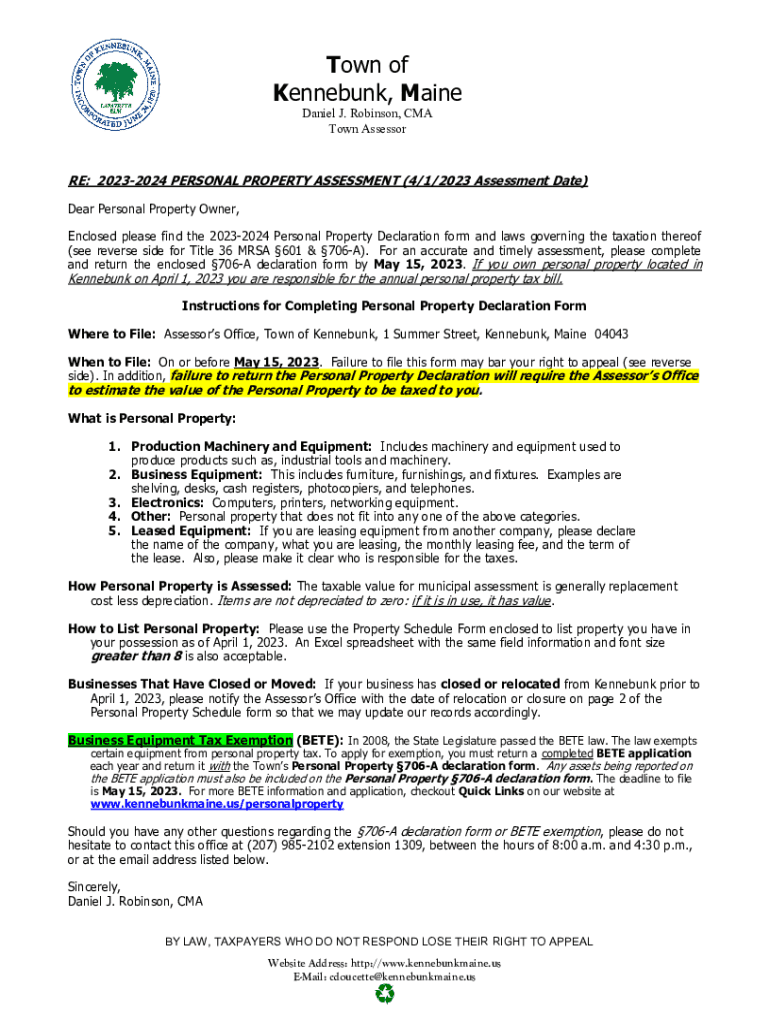 Town of Kennewick, Maine Daniel J. Robinson, CMA Town Assessor RE: 20232024 PERSONAL PROPERTY ASSESSMENT (4/1/2023 Assessment Date) Dear Personal Property Owner, Enclosed please find the 20232024