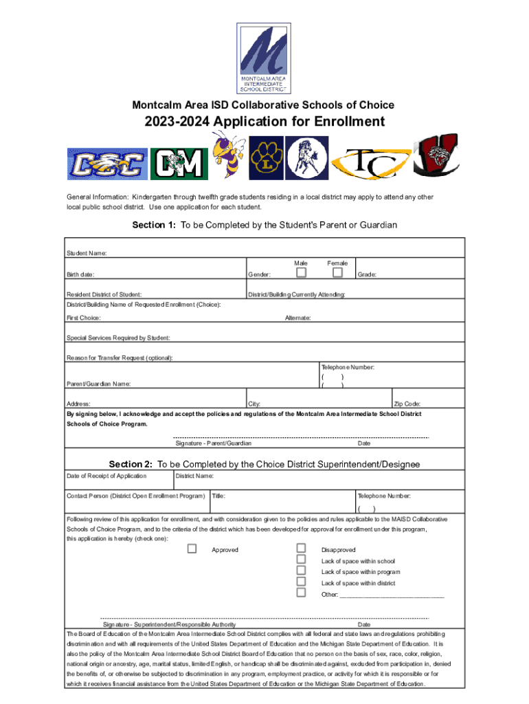 Montcalm Area ISD Collaborative Schools of Choice20232024 Application for EnrollmentGeneral Information: Kindergarten through twelfth grade students residing in a local district may apply to attend