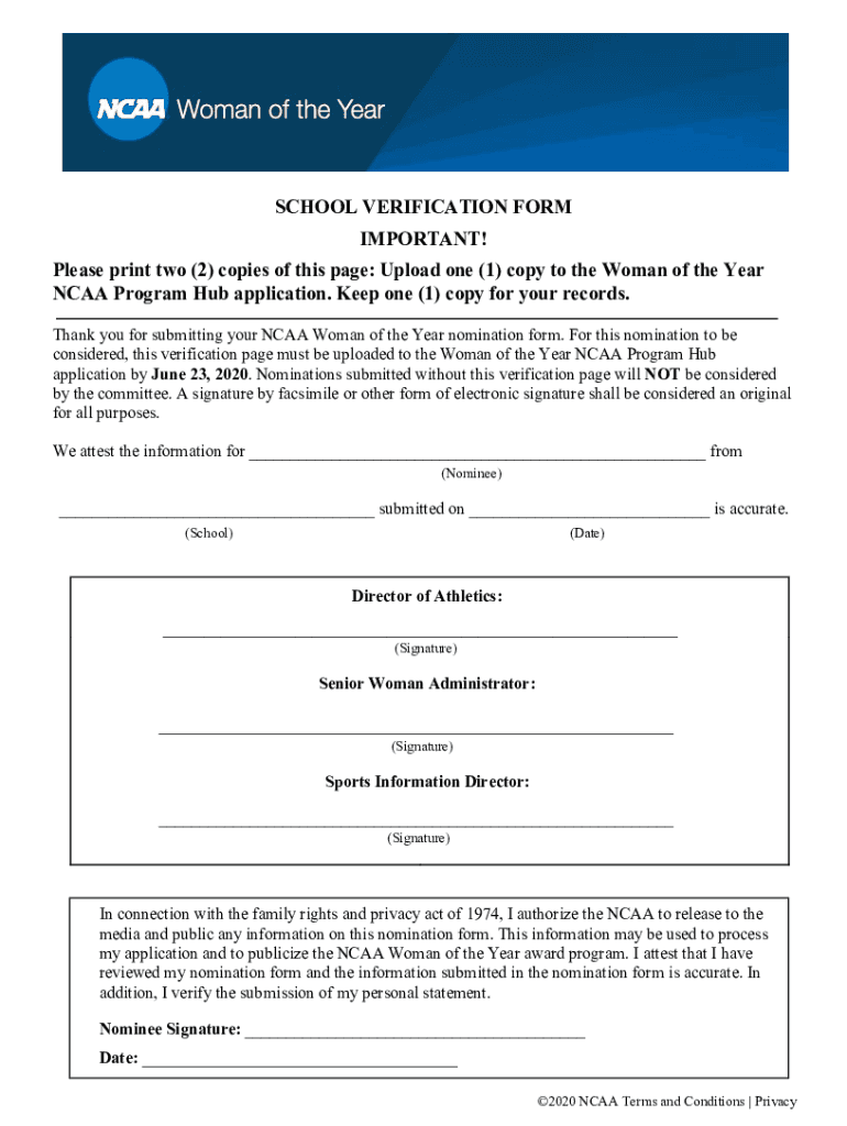 SCHOOL VERIFICATION FORM IMPORTANT! Please print two (2) copies of this page: Upload one (1) copy to the Woman of the Year NCAA Program Hub application. Keep one (1) copy for your records. Thank you