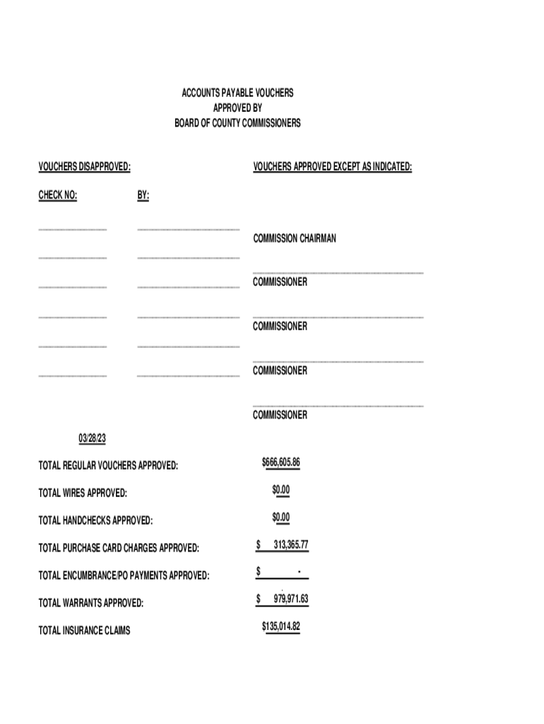 ACCOUNTS PAYABLE VOUCHERS APPROVED BY BOARD OF COUNTY COMMISSIONERSVOUCHERS DISAPPROVED:VOUCHERS APPROVED EXCEPT AS INDICATED:CHECK NO:BY:____________________________________COMMISSION CHAIRMAN ___