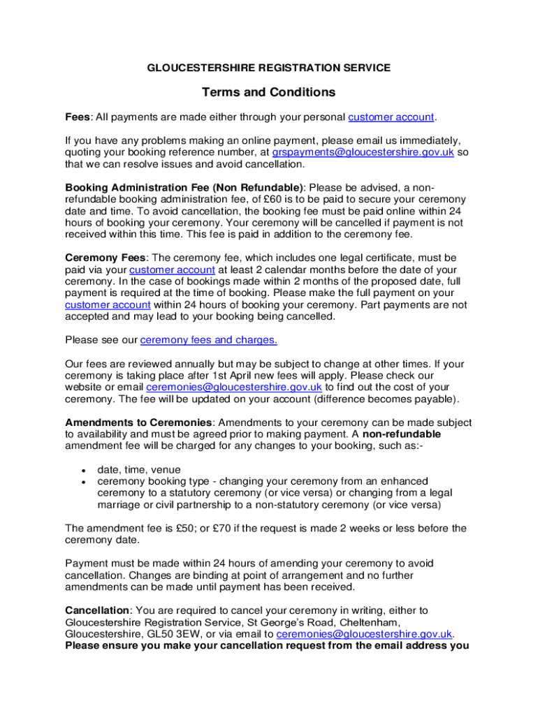 GLOUCESTERSHIRE REGISTRATION SERVICETerms and Conditions Fees: All payments are made either through your personal customer account. If you have any problems making an online payment, please email