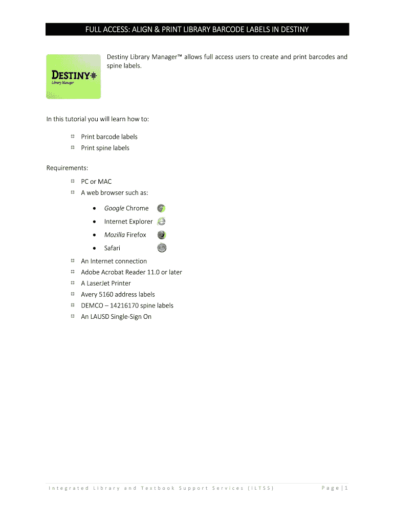 FULL ACCESS: ALIGN & PRINT LIBRARY BARCODE LABELS IN DESTINY Library Manager allows full access users to create and print barcodes and spine labels. In this tutorial you will learn how to: Print barcode