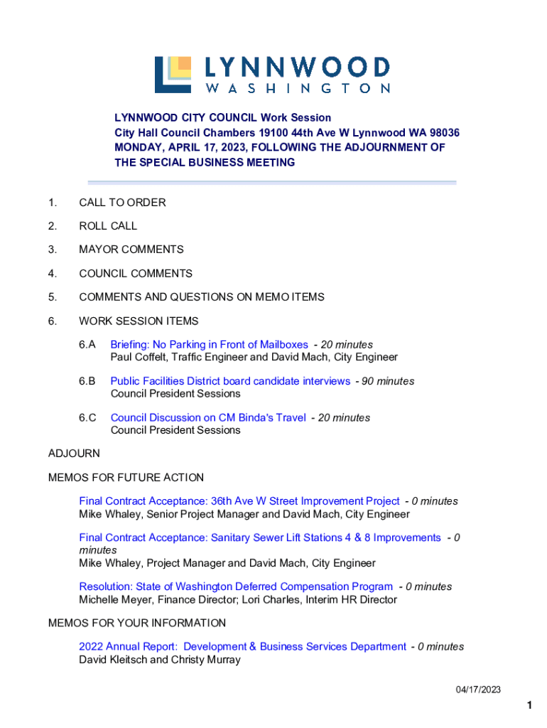 LYNNWOOD CITY COUNCIL Work Session City Hall Council Chambers 19100 44th Ave W Lynnwood WA 98036 MONDAY, APRIL 17, 2023, FOLLOWING THE ADJOURNMENT OF THE SPECIAL BUSINESS MEETING 1.CALL TO ORDER2.ROLL