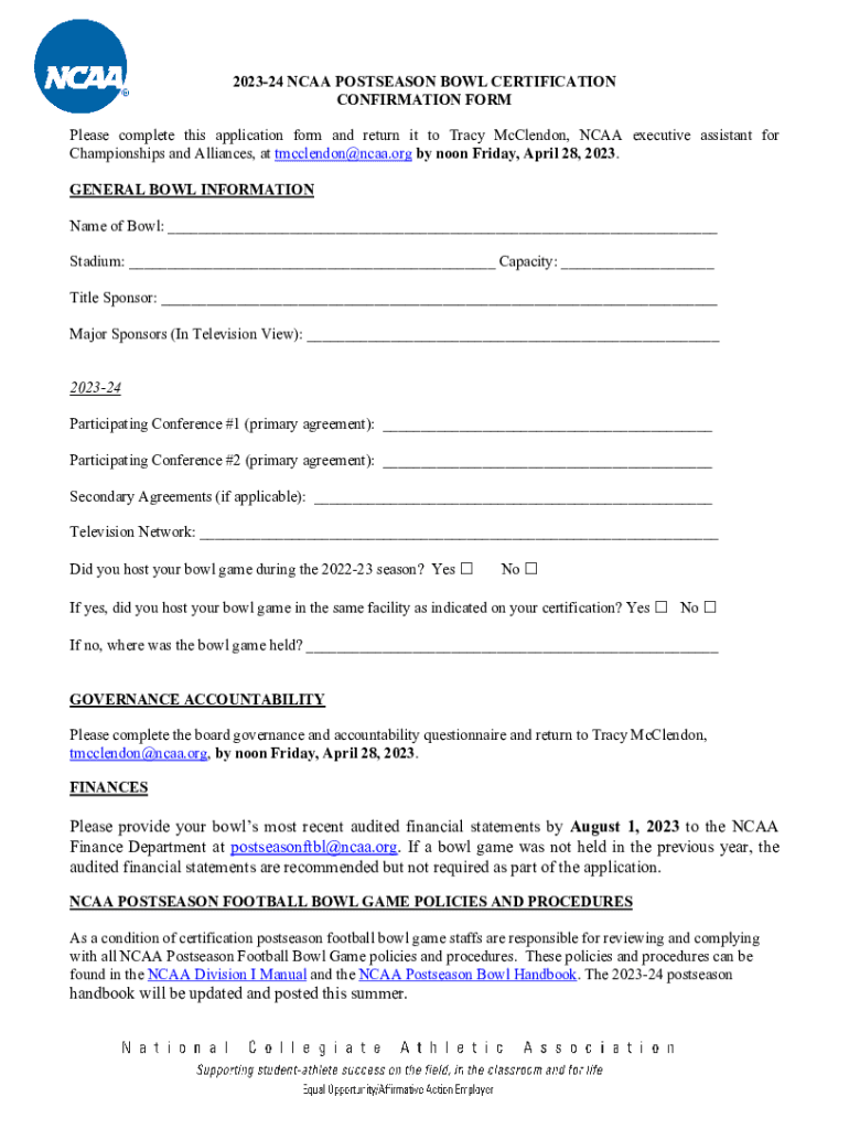 202324 NCAA POSTSEASON BOWL CERTIFICATION CONFIRMATION FORM Please complete this application form and return it to Tracy McClendon, NCAA executive assistant for Championships and Alliances, at tmcclendon@ncaa.org