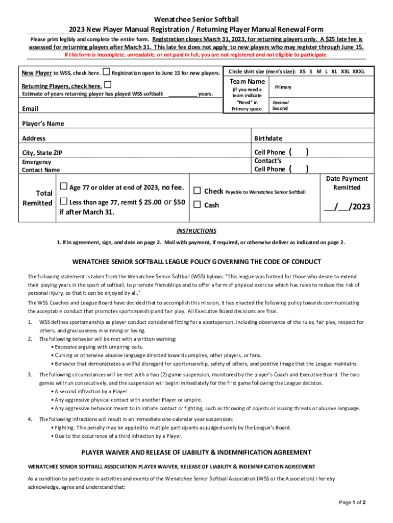 Wenatchee Senior Softball 2023 New Player Manual Registration / Returning Player Manual Renewal Form Please print legibly and complete the entire form. Registration closes March 31, 2023, for returning