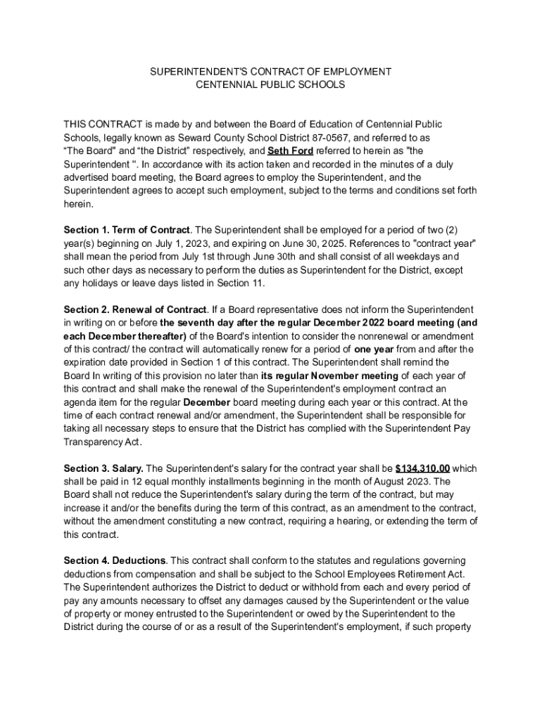 SUPERINTENDENT\'S CONTRACT OF EMPLOYMENT CENTENNIAL PUBLIC SCHOOLSTHIS CONTRACT is made by and between the Board of Education of Centennial Public Schools, legally known as Seward County School District