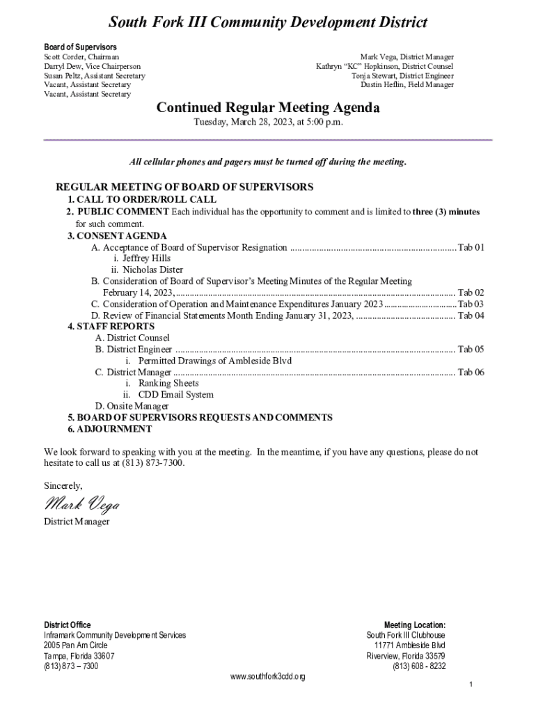 South Fork III Community Development District Board of Supervisors Scott Order, Chairman Darryl Dew, Vice Chairperson Susan Pelts, Assistant Secretary Vacant, Assistant Secretary Vacant, Assistant