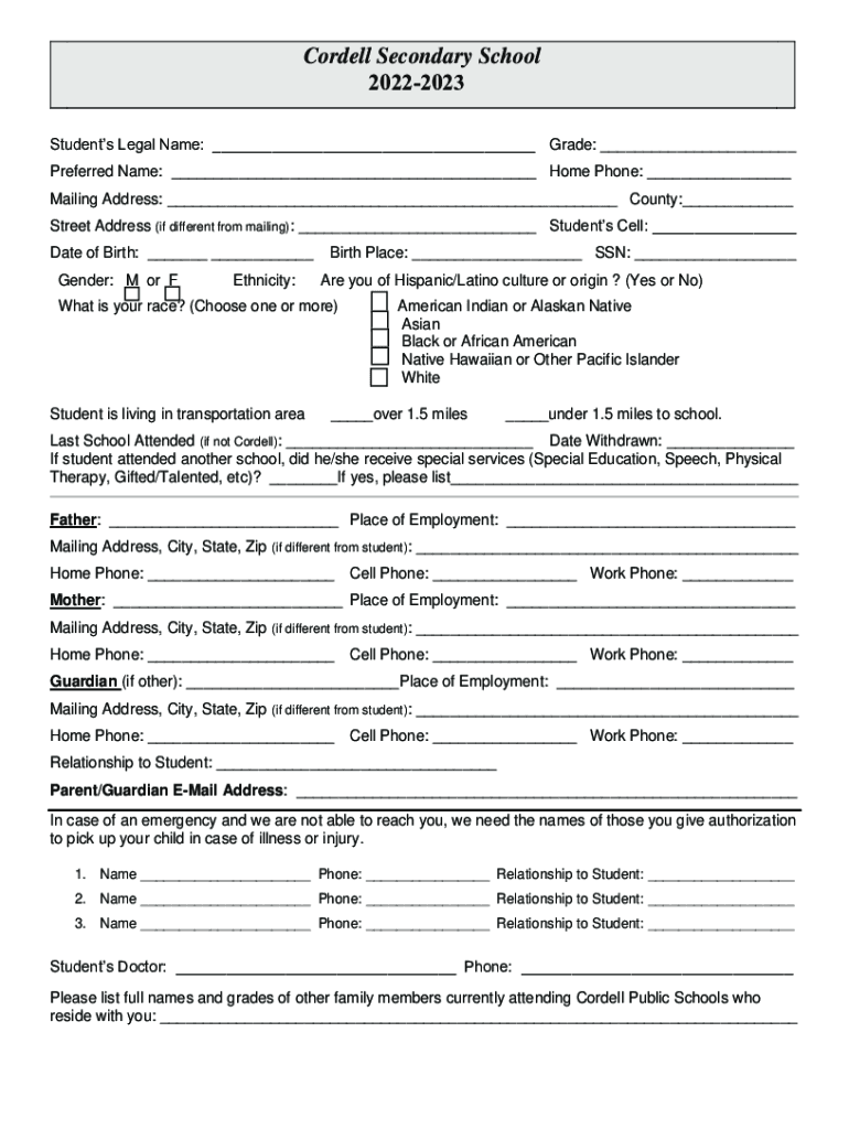 Cordell Secondary School 20222023 Students Legal Name: ___ Grade: ___ Preferred Name: ___ Home Phone: ___ Mailing Address: ___ County:___ Street Address (if different from mailing): ___ Students Cell: