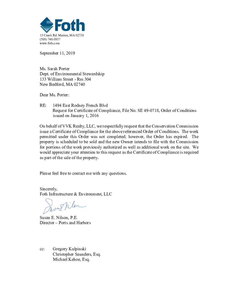 15 Creek Rd. Marion, MA 02738 (508) 7480937 www.foth.comSeptember 11, 2019Ms. Sarah Porter Dept. of Environmental Stewardship 133 William Street Rm 304 New Bedford, MA 02740 Dear Ms. Porter: RE:1494