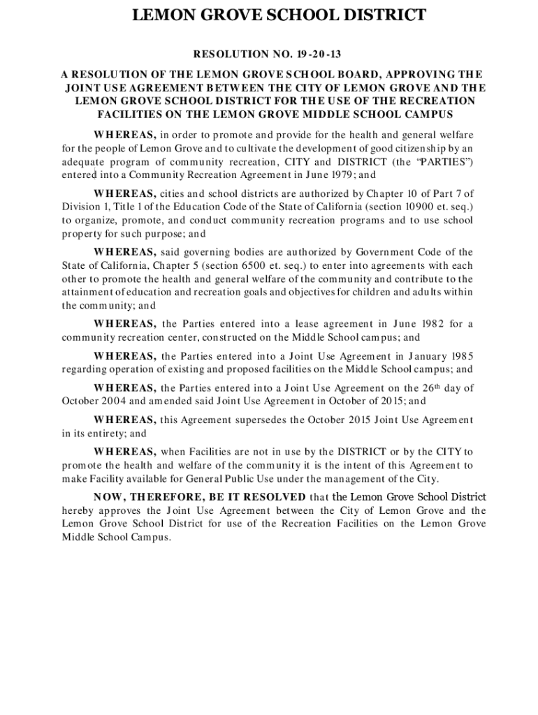 LEMON GROVE SCHOOL DISTRICT RESOLUTION NO. 192013 A RESOLUTION OF THE LEMON GROVE SCHOOL BOARD, APPROVING THE JOINT USE AGREEMENT BETWEEN THE CITY OF LEMON GROVE AND THE LEMON GROVE SCHOOL DISTRICT