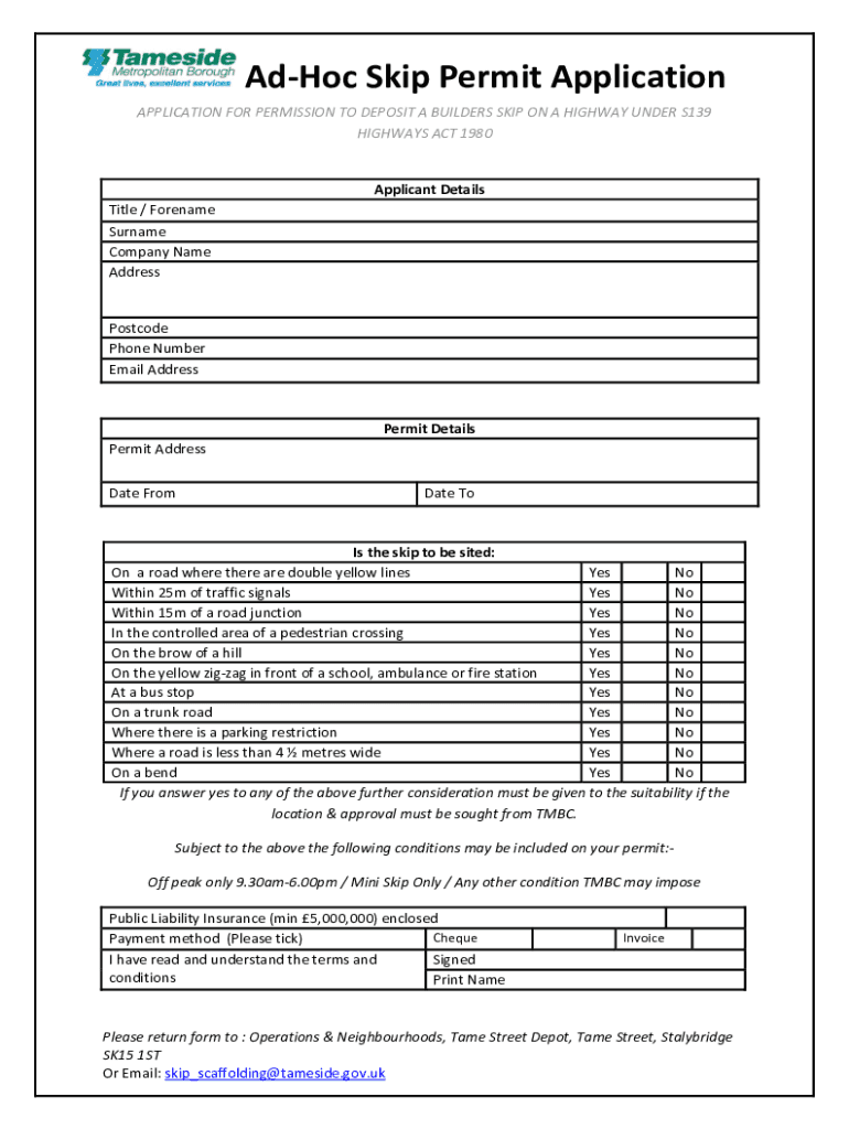 Hoc Skip Permit Application FOR PERMISSION TO DEPOSIT A BUILDERS SKIP ON A HIGHWAY UNDER S139