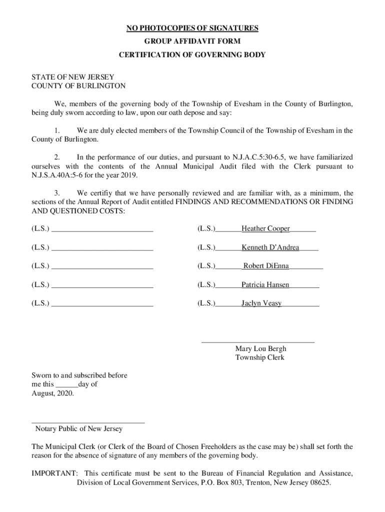 NO PHOTOCOPIES OF SIGNATURES GROUP AFFIDAVIT FORM CERTIFICATION OF GOVERNING BODY STATE OF NEW JERSEY COUNTY OF BURLINGTON We, members of the governing body of the Township of Eve sham in the County
